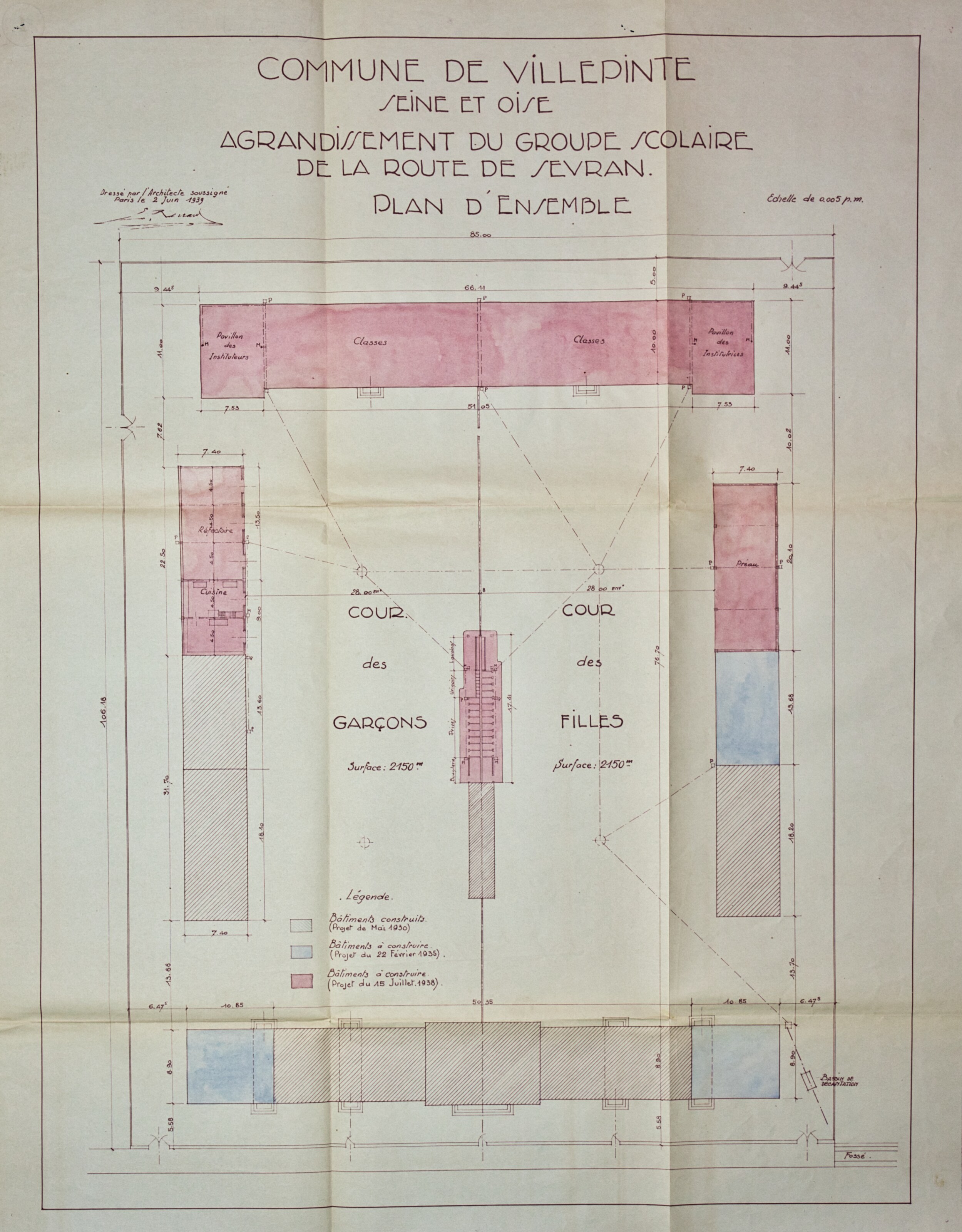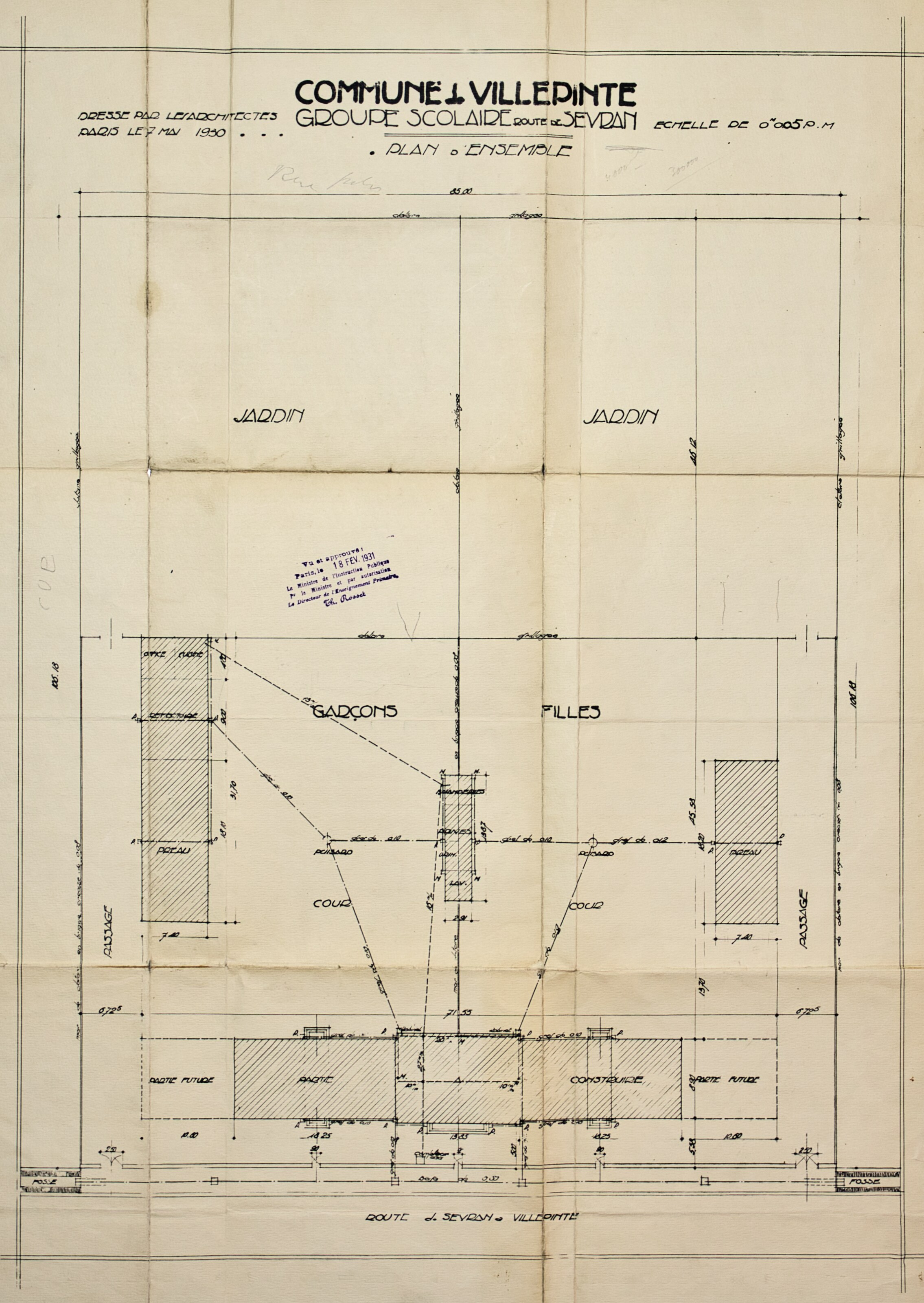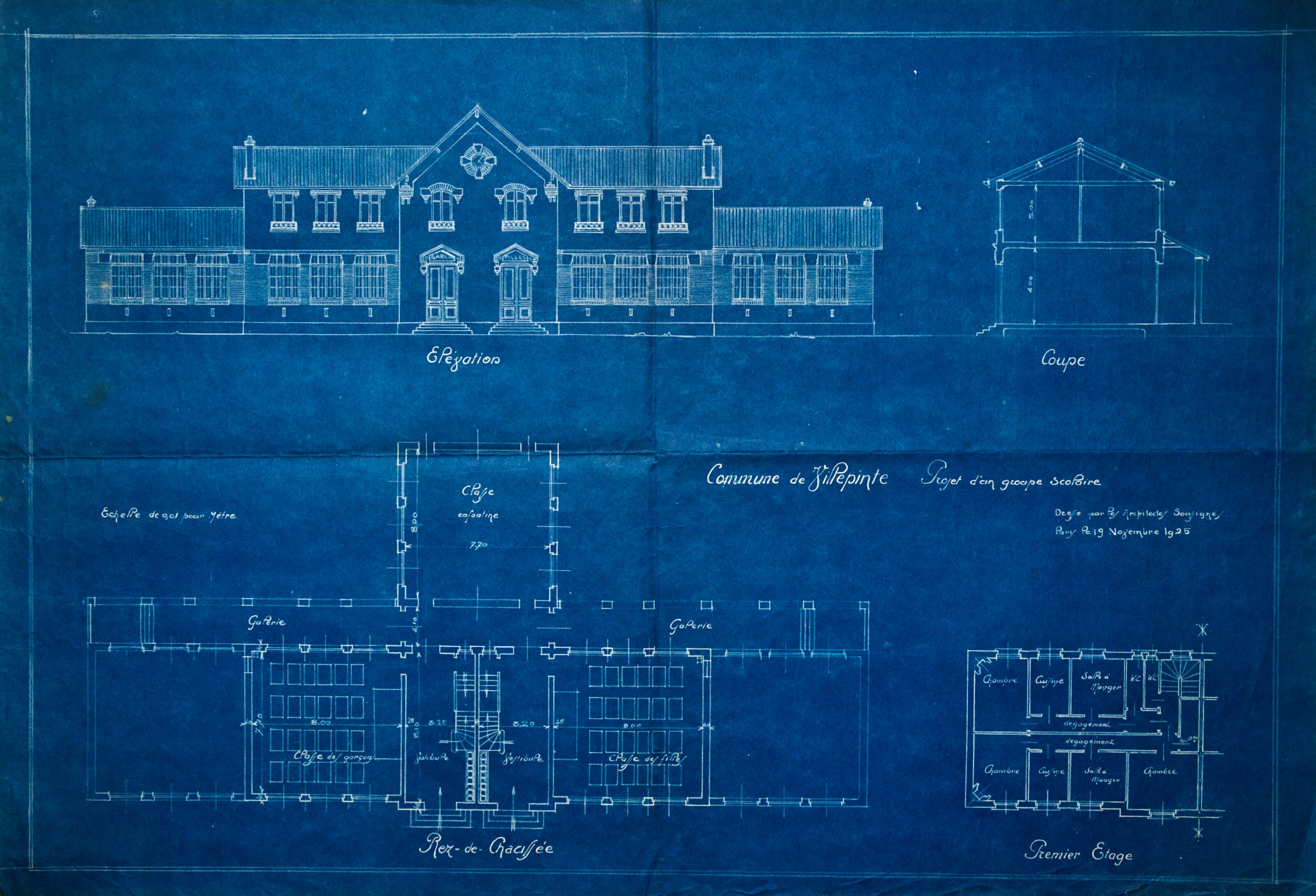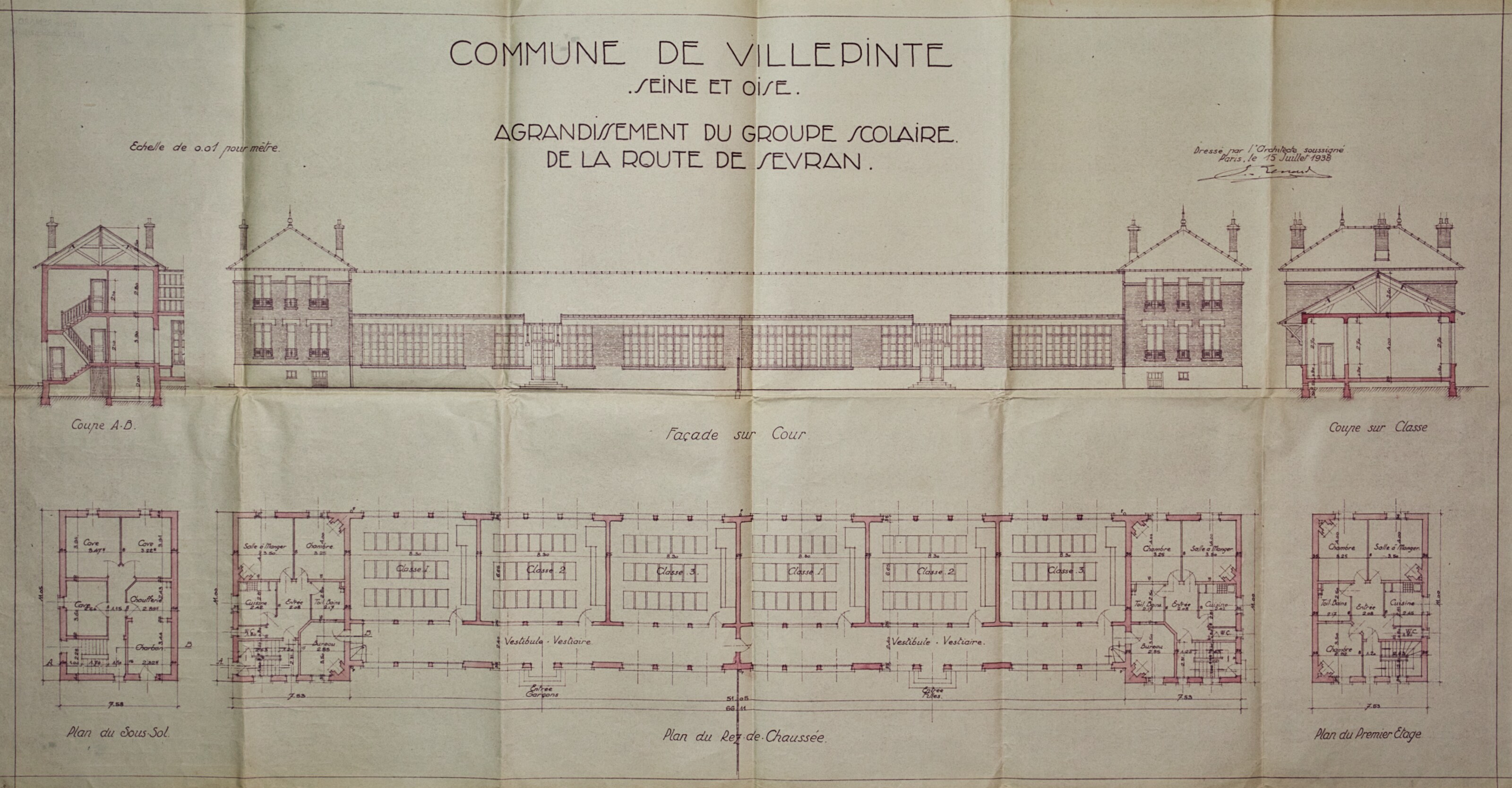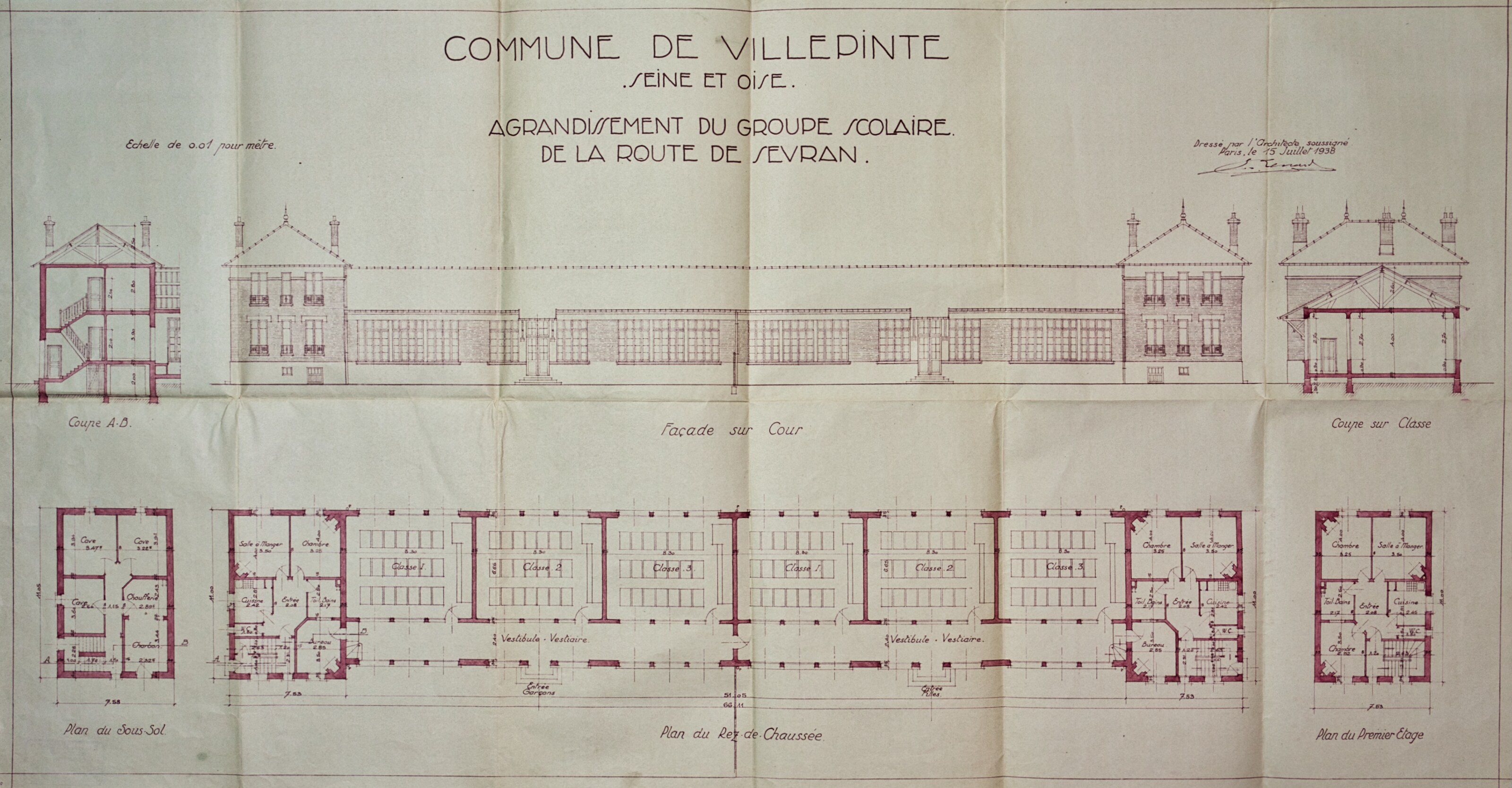 Plans de l'École du Centre Plan du projet d’un Groupe scolaire – 1925 Plan de la façade postérieure de l’avant-projet de l’École du Centre – 1926 Plan de l’élévation, de la coupe, du rez-de-chaussée et du 1er étage de l’avant-projet de l’École du Centre – 1926 Plan d’ensemble de l’École du Centre – 1930 Plan des façades de l’École du Centre – 1930 Plan de l'École du Centre - 1930 Plan d’une parcelle de terre destinée à la construction de l’École du Centre – 1930 Plan d’un terrain destiné à la construction de l’École du Centre – 1930 Plan des terrains a exproprier pour la construction de l’École du Centre – 1930 Plan d’un terrain destiné à la construction de l’École du Centre – 1930 Plan du projet d’agrandissement de l’École du Centre – Annexe au bâtiment principal – 1935 Plan du projet d’agrandissement de l’École du Centre – Préau – 1935 Plan du projet d’agrandissement de l’École du Centre – Aménagement d’un bureau dans le vestibule d’entrée – 1935 Plan de l’agrandissement de l’École du Centre – 1938 Plan de l’agrandissement de l’École du Centre – 1938 Plan de la buanderie et des privés de l’École du Centre – 1938 Plan du Préau de l’École du Centre – 1938 Plan du Réfectoire, de la Cuisine et de l’Office de l’École du Centre – 1938 Plan d’ensemble de l’agrandissement de l’École du Centre – 1939 Plan d’ensemble de l’agrandissement de l’École du Centre – 1939 Plan d’ensemble de l’agrandissement de l’École du Centre – 1939 Plan des façades latérale et postérieure côté garçon de l’agrandissement l’École du Centre – 1939 Plan des façades latérale et postérieure côté garçon de l’agrandissement l’École du Centre – 1939 Plan du rez-de-chaussée et de l’étage de l’agrandissement l’École du Centre – 1939 Plan du sous-sol et des fondations de l’agrandissement l’École du Centre – 1939 Plan de l’agrandissement de l’École du Centre – 1939 Plan du Terrain d’Entrainement et de Jeux Scolaires de l’École du Centre – 1941 Plan du Terrain de sport de l’École du Centre – 1941 Next