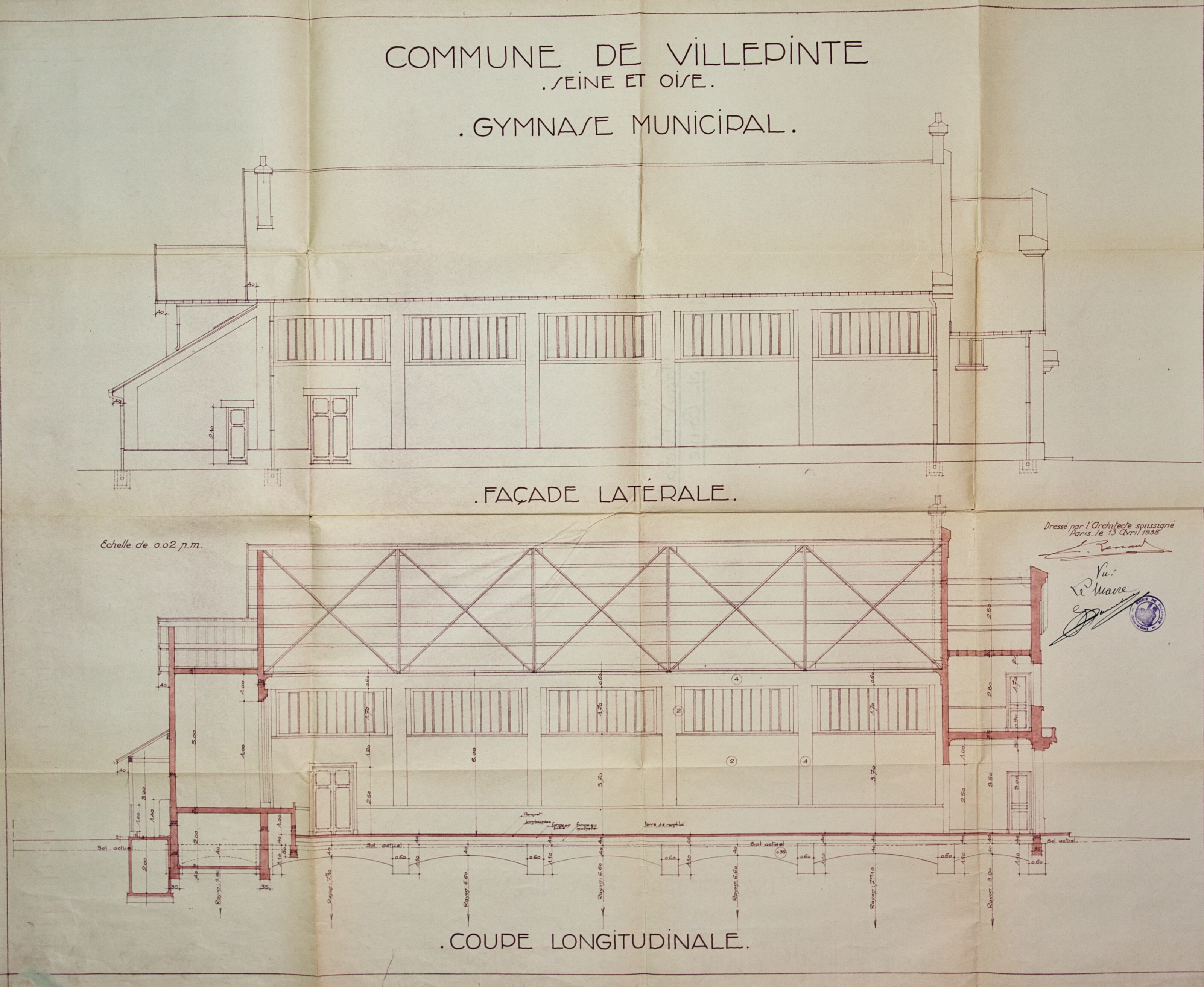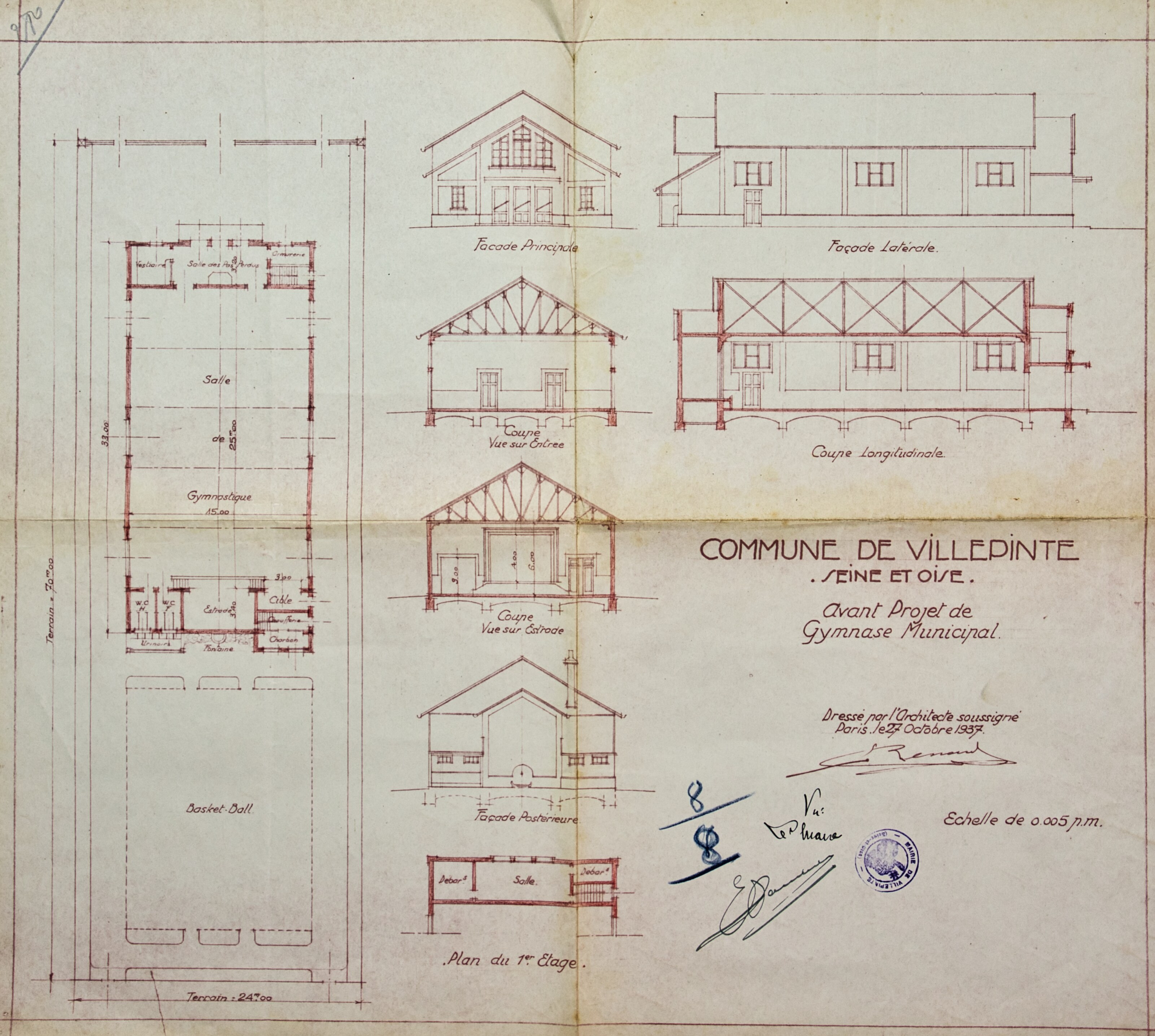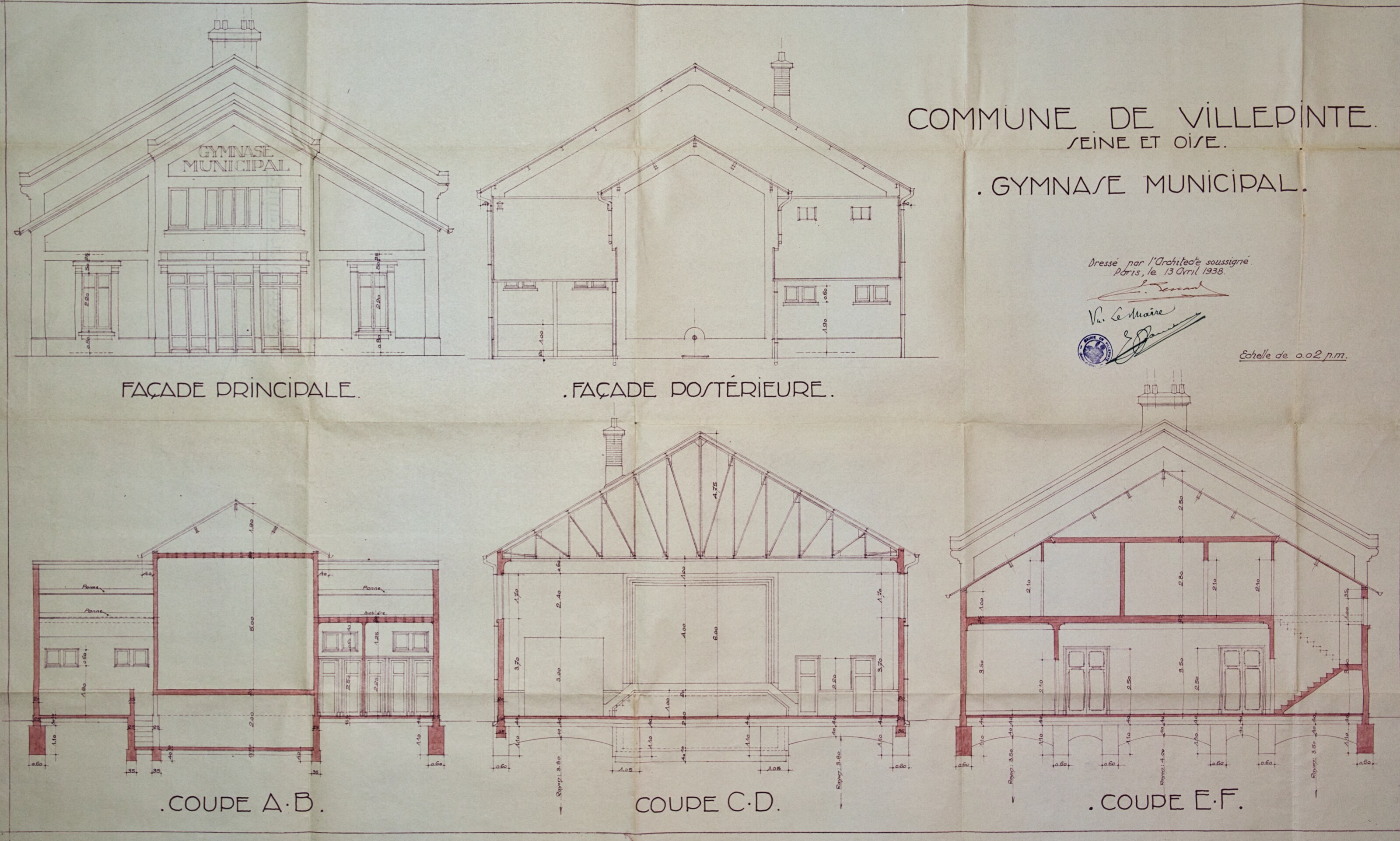 Plans du Gymnase Municipal 1938 Plan de situation de l'avant-projet du Gymnase Municipal - 1937 Plan de l'avant-projet du Gymnase Municipal - 1937 Plan d'ensemble du Gymnase Municipal - 1938 Plan des façades et des coupes du Gymnase Municipal - 1938 Plan de la façade latérale et de la coupe longitudinale du Gymnase Municipal - 1938 Plan du rez-de-chaussée et du 1er étage du Gymnase Municipal - 1938 Next
