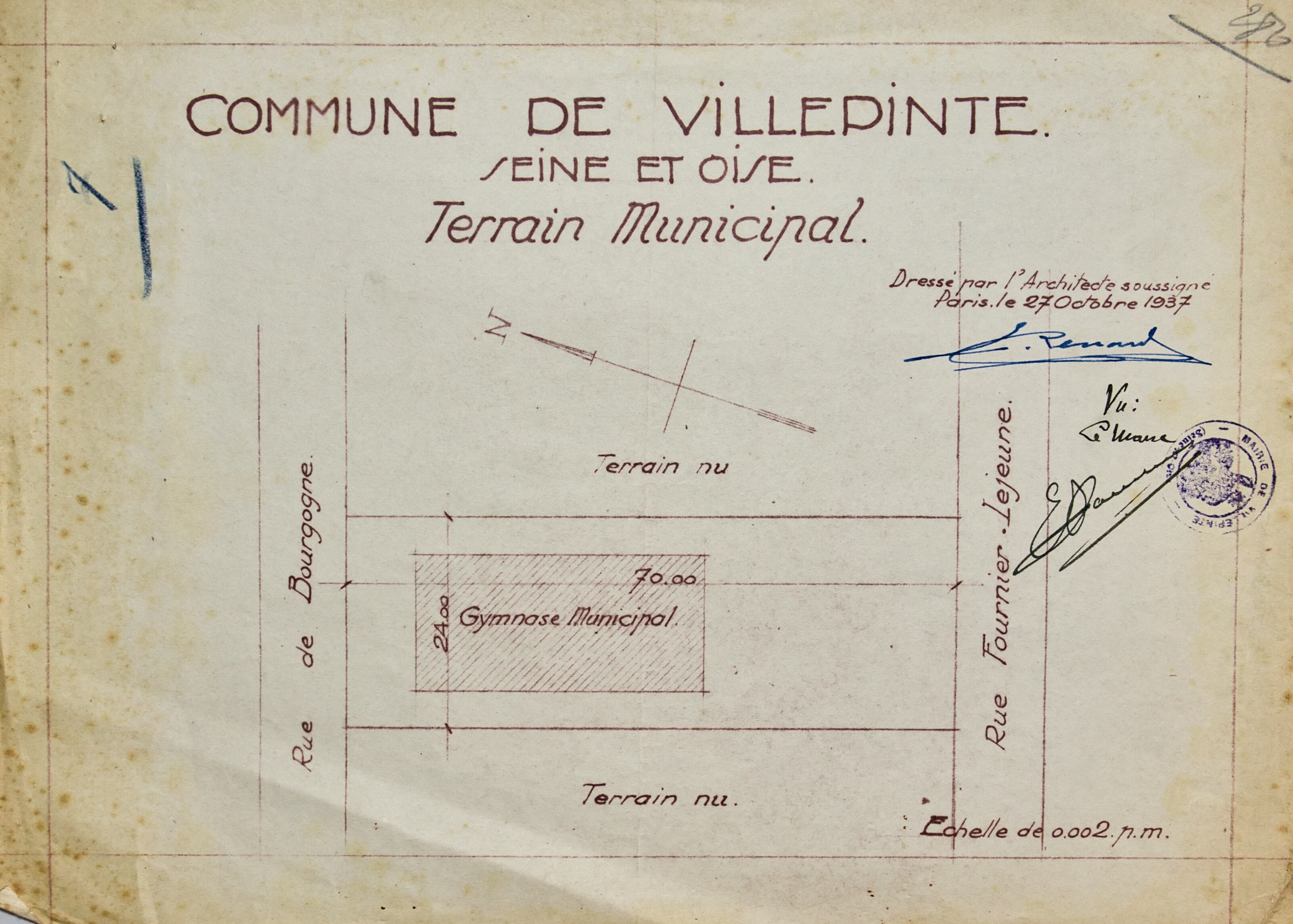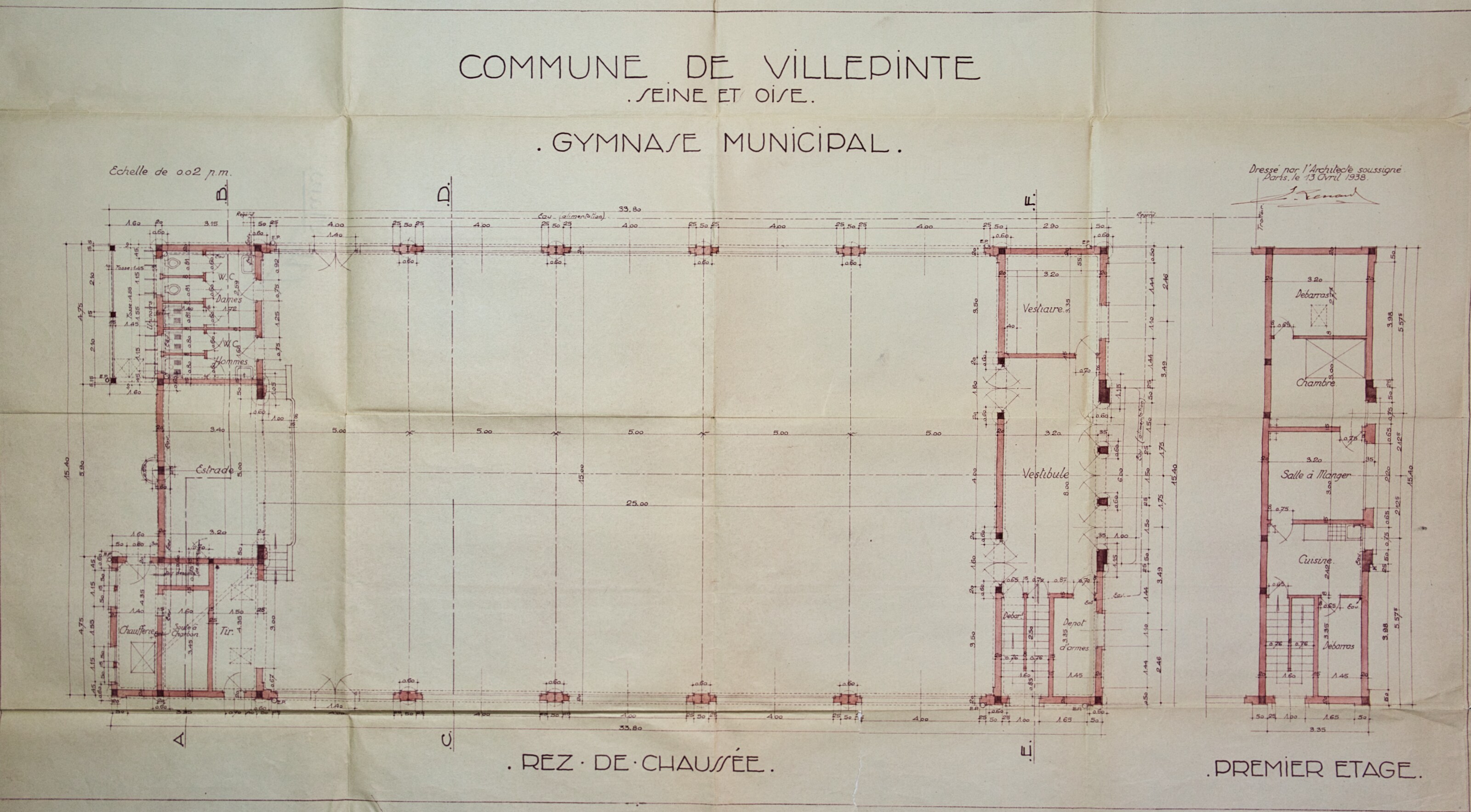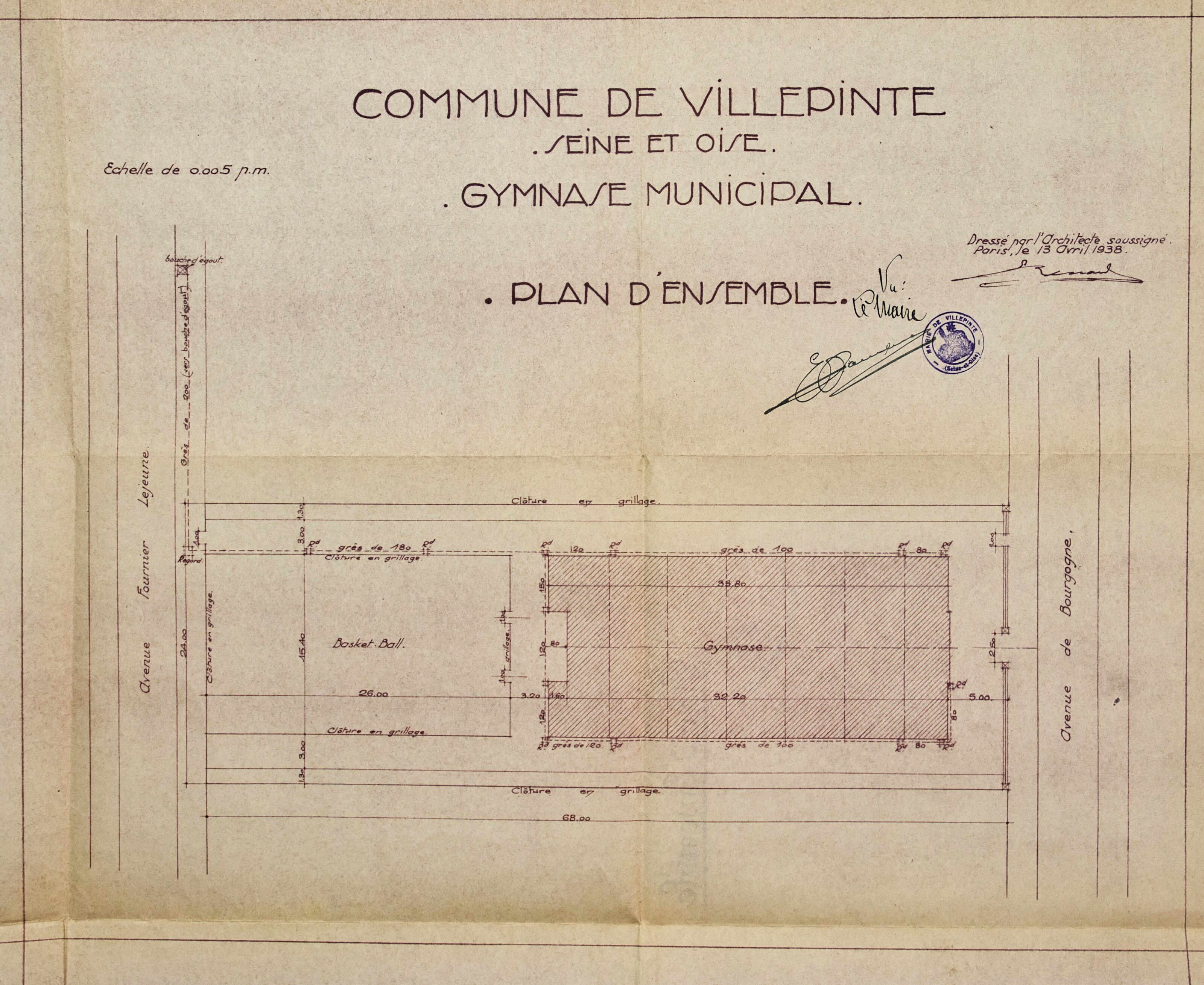 Plans du Gymnase Municipal 1938 Plan de situation de l'avant-projet du Gymnase Municipal - 1937 Plan de l'avant-projet du Gymnase Municipal - 1937 Plan d'ensemble du Gymnase Municipal - 1938 Plan des façades et des coupes du Gymnase Municipal - 1938 Plan de la façade latérale et de la coupe longitudinale du Gymnase Municipal - 1938 Plan du rez-de-chaussée et du 1er étage du Gymnase Municipal - 1938 Next