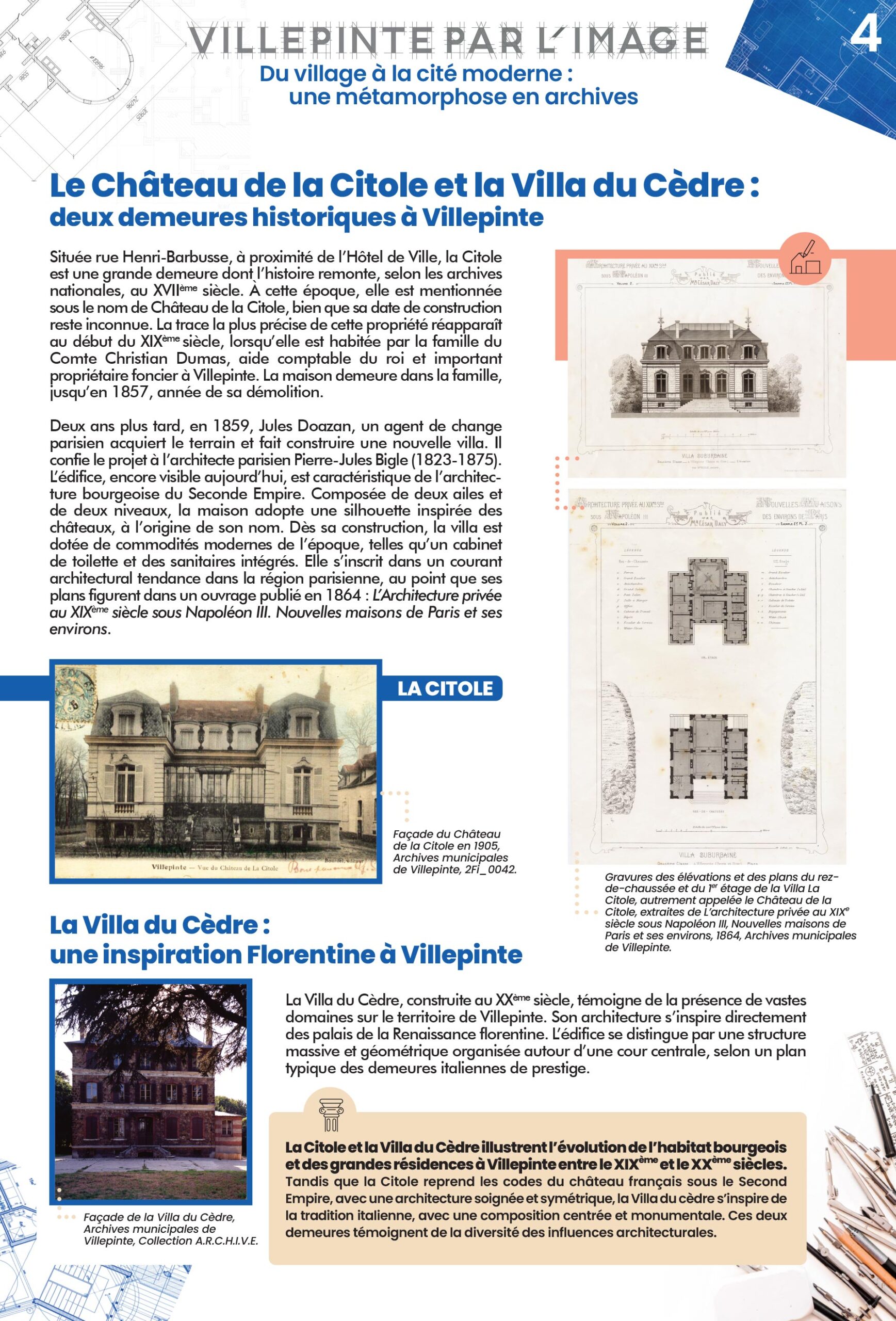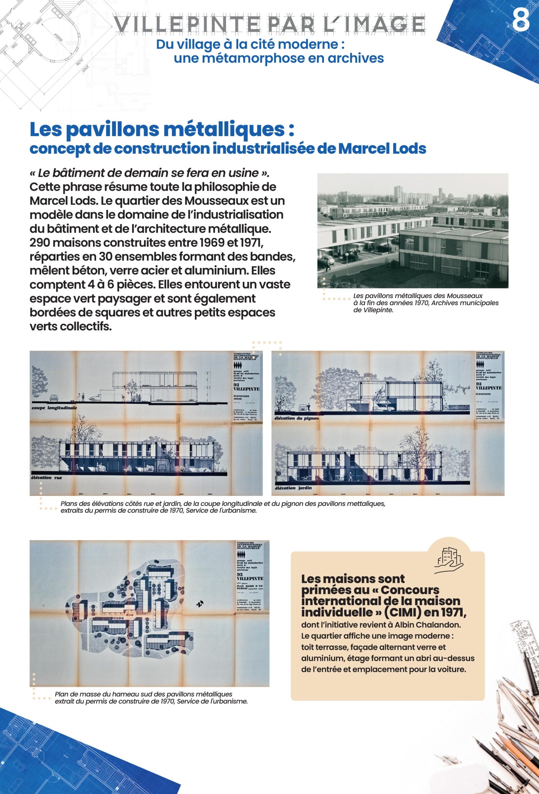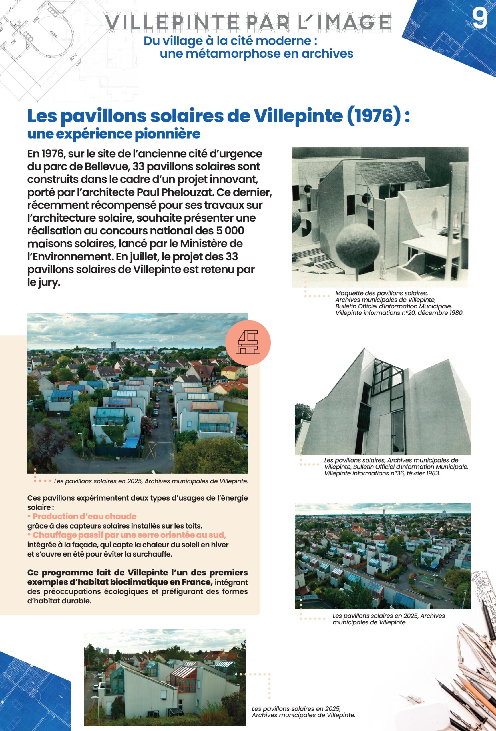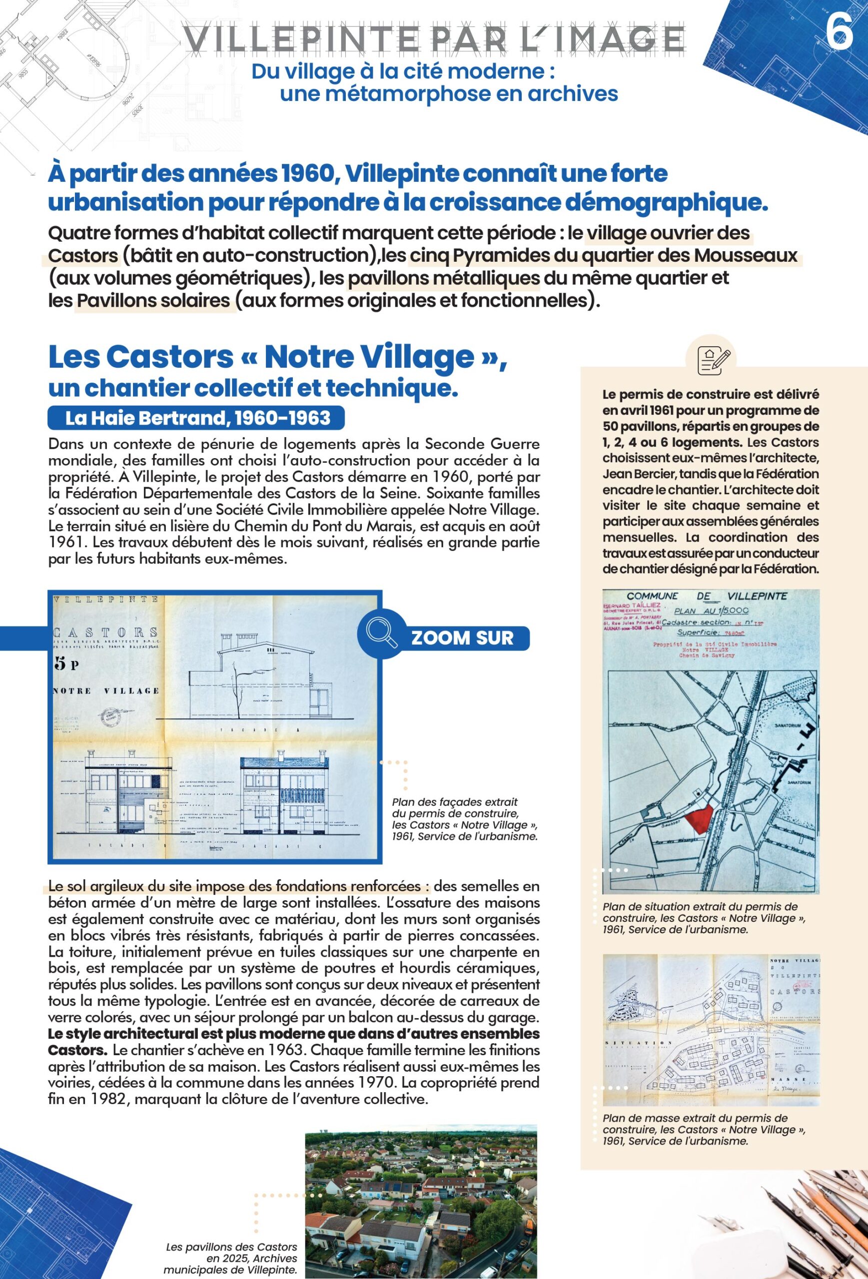 Dans l'élan des Trente Glorieuses, Villepinte devient un terrain d'expérimentation architecturale. Le village des Castors, les Pyramides et les Pavillons métalliques des Mousseaux ou encore les Pavillons solaires incarnent quatre formes singulières d'habitat, témoins des réflexions sur le logement et la modernité. .